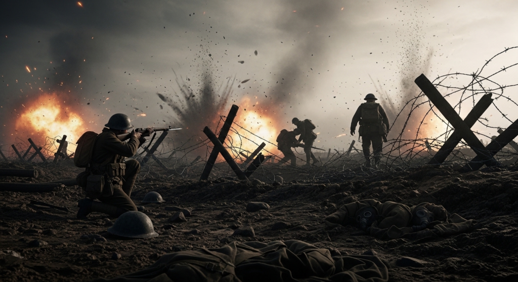 1914년 여름, 사라예보에서 울린 총성은 유럽 전역을 전쟁의 소용돌이로 몰아넣었습니다. 제1차 세계대전은 이전과는 비교할 수 없는 규모와 파괴력을 자랑했습니다. 참호전이라는 비인간적인 전술, 독가스와 같은 신무기의 등장, 그리고 수백만 명의 무고한 생명이 스러져간 참상은 전쟁의 잔혹성을 여실히 보여주었습니다.
